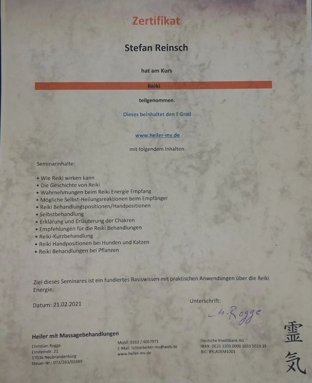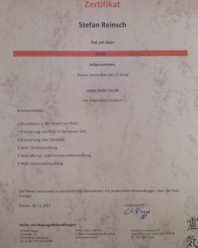 Zertifikat Reiki II. Grad / Certificate Reiki II. degree
